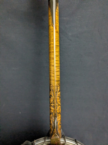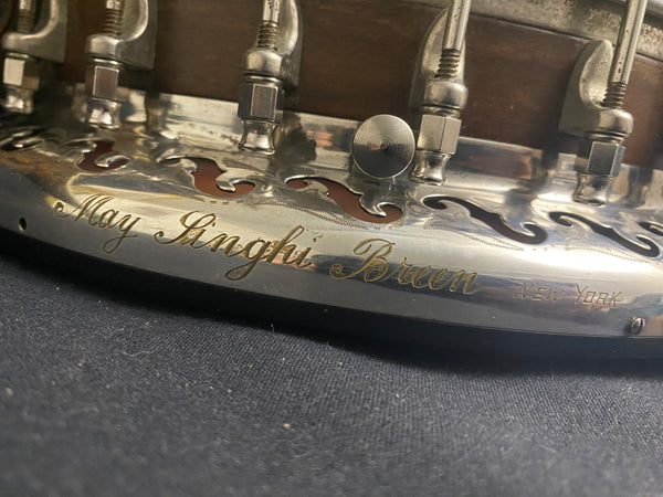 This one of a kind tenor banjo was built for May Singhi Breen as seen by the custom engraving on the bass side of the resonator flange (photographed). For the unfamiliar, May Singhi Breen was a a radio recording star from the 1920's through the 40's. She was also famously known as a person who popularized the ukulele during that time.