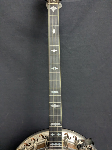 This banjo is exceptionally loud and crisp. It is currently tuned Irish but would be a fantastic jazz banjo and shows beautiful pearl inlay work as well as a gorgeous back pot.