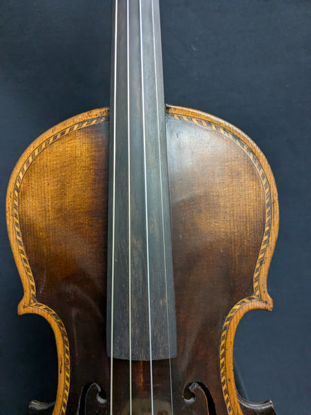 Unlabeled, probably German-made, visually interesting folk-style violin with fancy rope purfling and shell inlay in back. Professionally reconditioned and set up to proper specs with new bridge, soundpost, ebony pegs and chin rest, reconditioned old tailpiece with floral shell and silver wire inlay. Pro Arte synthetic core strings.