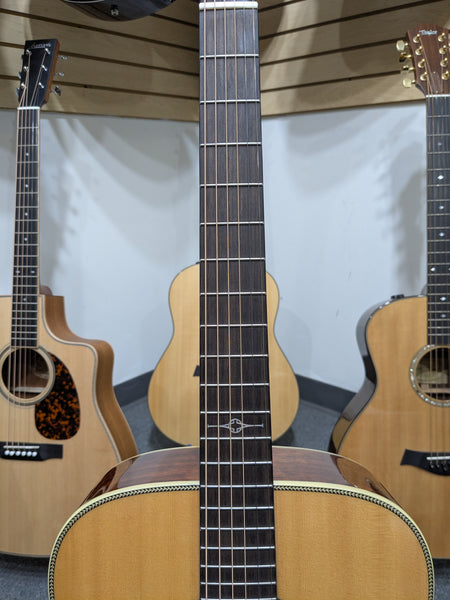 It has a beautiful pearl inlay herringbone pattern along the binding and comes equipped with an LR Baggs undersaddle pickup.