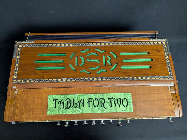 Has "Tabla for Two" plaque on top, referring to the musical duo "Tabla for Two"-- previous owners of this harmonium.