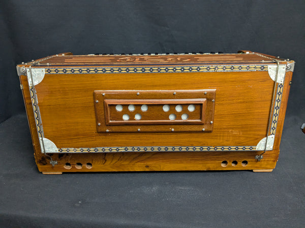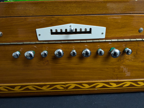 This is a beautiful harmonium with a 3-octave keyboard. The instrument has Palitana brass reeds (perfect for Ghazal singing), 4 stops and 5 drones, and the wood is teak. The bellows have good compression giving the instrument excellent volume, especially if your a singer. Some minor wear can be found on the body, but nothing unusual for a used harmonium.