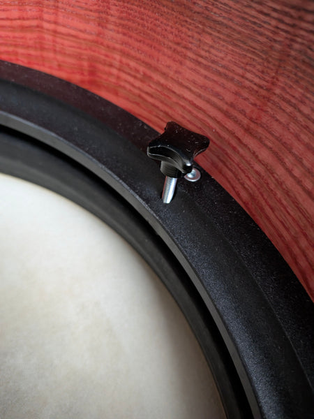Our current drum in stock is 37 x 14 cm (14.5 x 5.5 inches), and has a frame made of solid figured ash with a red/black oil & wax finish. It has a Kentville Drums kangaroo skin, with Universal Comfort tuning rim.