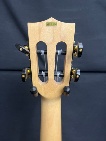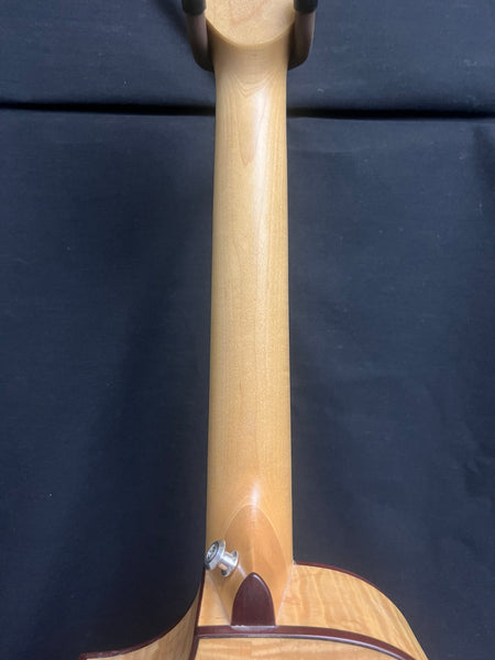The Solid Flame Maple series is an all Maple build, including the neck. Maple offers a clear, transparent tone, and strong projection with great note separation. The figuring of the Maple is boldly accented with a purpleheart binding and rosette. Enhanced with a slotted headstock, Florentine cutaway, and an onboard Fishman Kula EQ, this tenor ukulele stands out in a crowd.