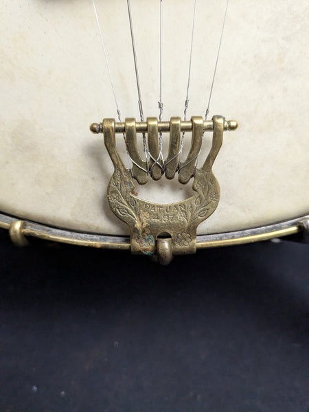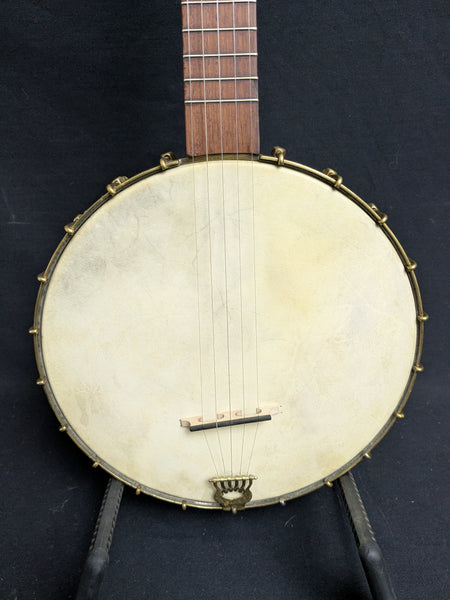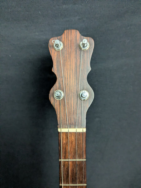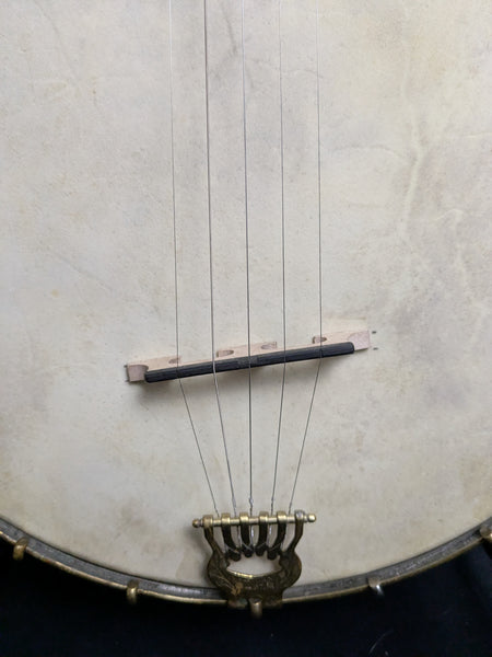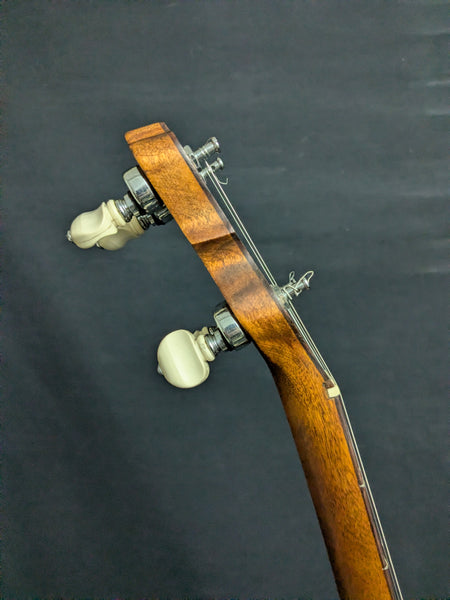 Calfskin head produces authentic old-time sound. Good older 2:1 ratio geared tuners in place of original violin-type taper pegs; friction 5th peg.