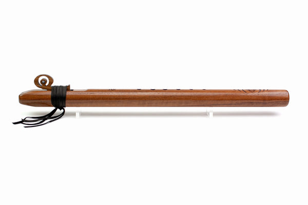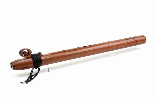 This is a large bass flute with a very deep and beautiful musical voice but because of its size (fingering holes and flute diameter) we highly recommended it for those with large hands and/or wide fingers. It's length is approximately 27-inches (69 cm.)
