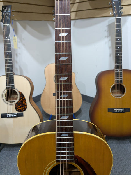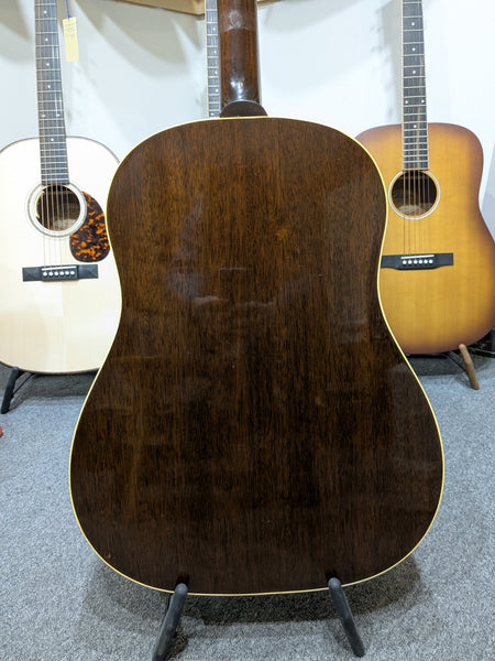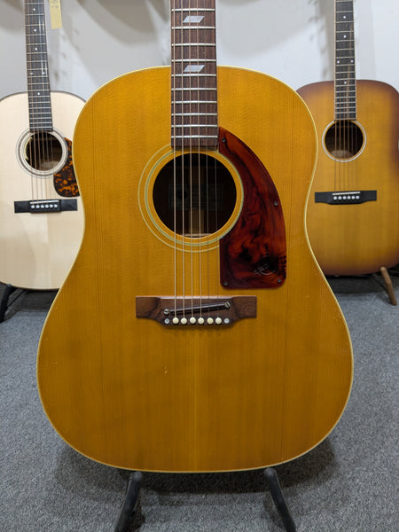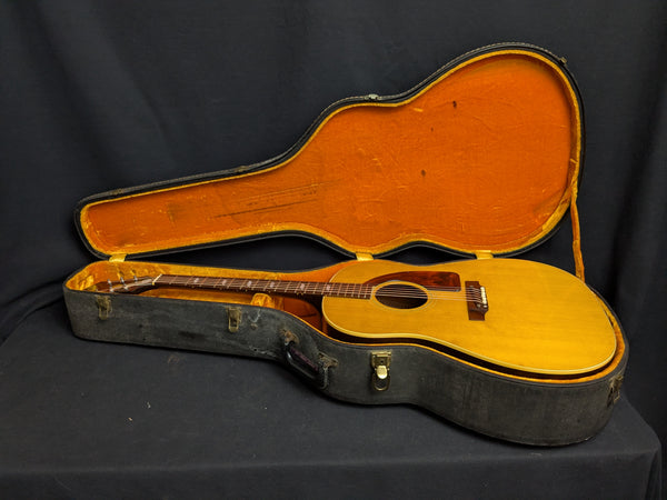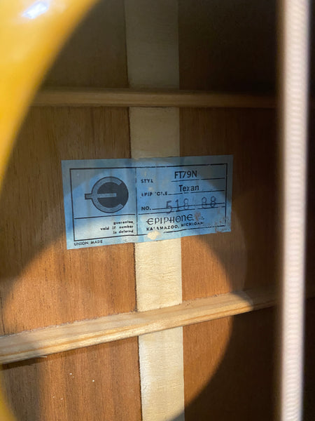This very cool vintage Epiphone dreadnought has had a full setup. It plays great and is super comfortable. Frets are level and in good shape. Original nut, frets, bolted on bridge, wood saddle, tuners are intact and holding strong! We don't have an exact date on this but it is likely a 1960's era guitar.