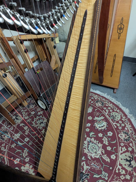 A great travel harp with a sweet, delicate tone, great for extra ornamentation in playing. It has a beautiful flamed maple soundboard and intricate geometric purfling.